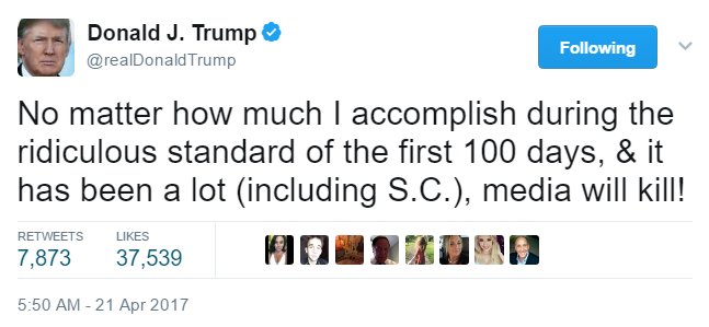 President Donald Trump tweeted Friday about the "ridiculous standard" by which he will be judged on his accomplishments during his first 100 days in office.